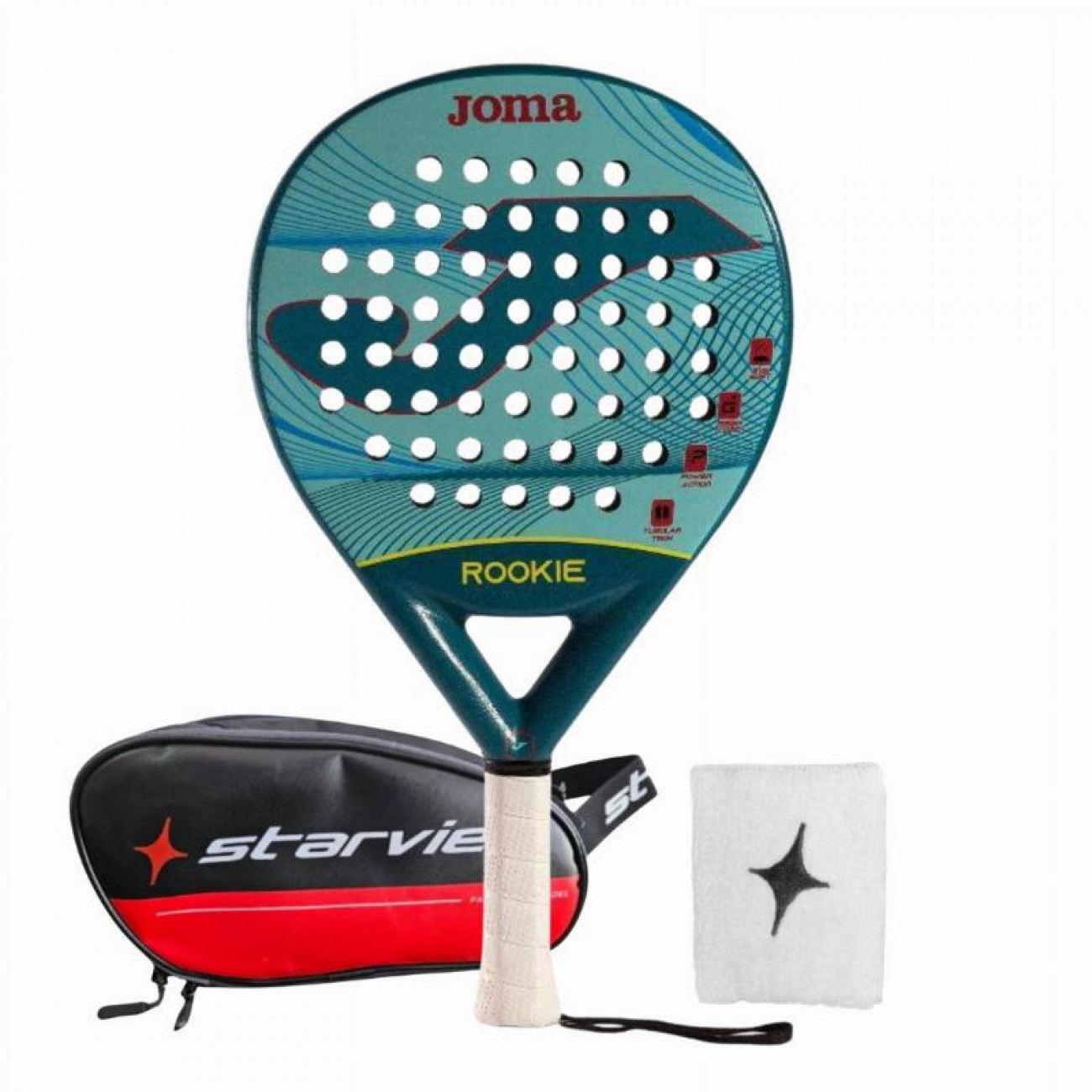 Este pack está diseñado para jugadores que se inician en el pádel o que buscan una pala ligera, manejable y con una estética cuidada. Incluye la pala Joma Rookie en azul, junto con dos accesorios de gran utilidad: un neceser y una muñequera de StarVie.