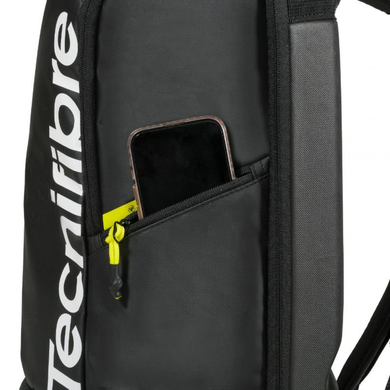 Design premium, em preto fosco com detalhes amarelos intensos, elegante e alinhado com a linha de raquetes da Tecnifibre.