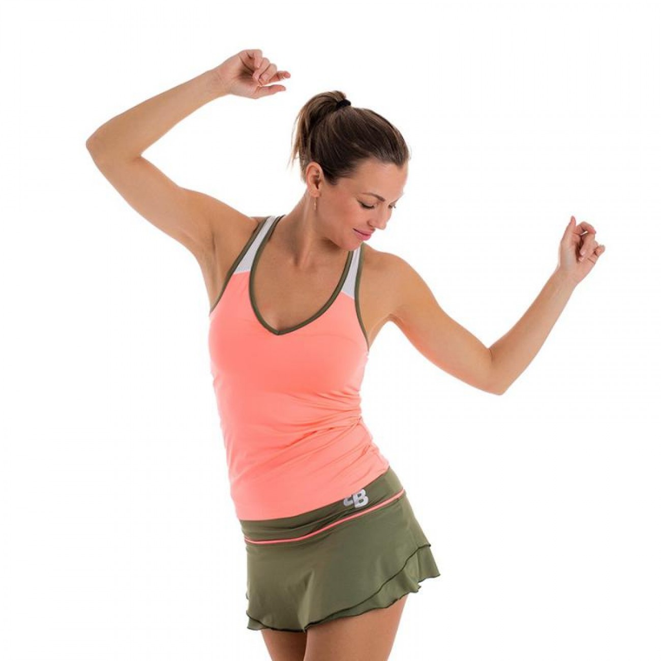 Su diseno moderno y elegante, en tono coral light, verde oliva y blanco, te hara destacar en la pista.